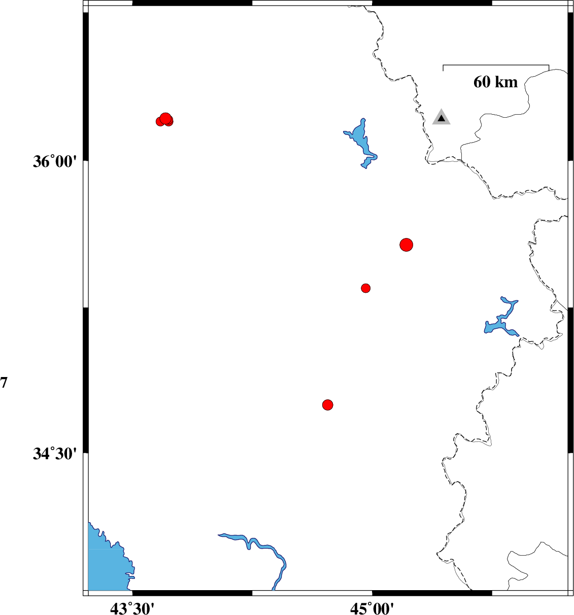 2018/10/25 | 07:30:27.1 | 11:00:27.1 | 36.125 | 45.697 | 14 | ML:3.5 | Kurdistan Province, 21 km -East of Sardasht | ||