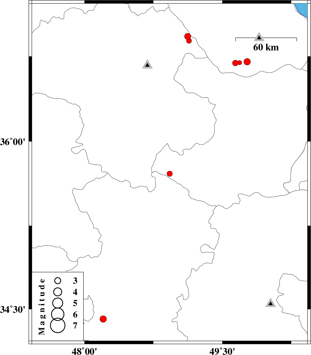 | 2018/10/14 | 01:52:09.4 | 05:22:09.4 | 36.695 | 49.687 | 6 | ML:2.1 | Gilan Province, 27 km South-East of Rudbar | ||