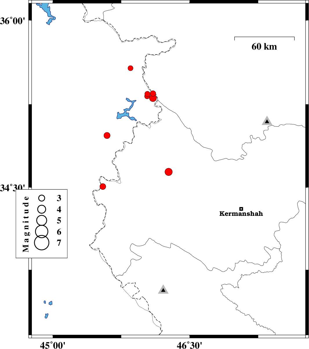 2018/11/01 | 16:35:55.3 | 20:05:55.3 | 33.942 | 46.441 | 15 | ML:3.6 | Kermanshah Province, 18 km North-East of Eyvan | ||