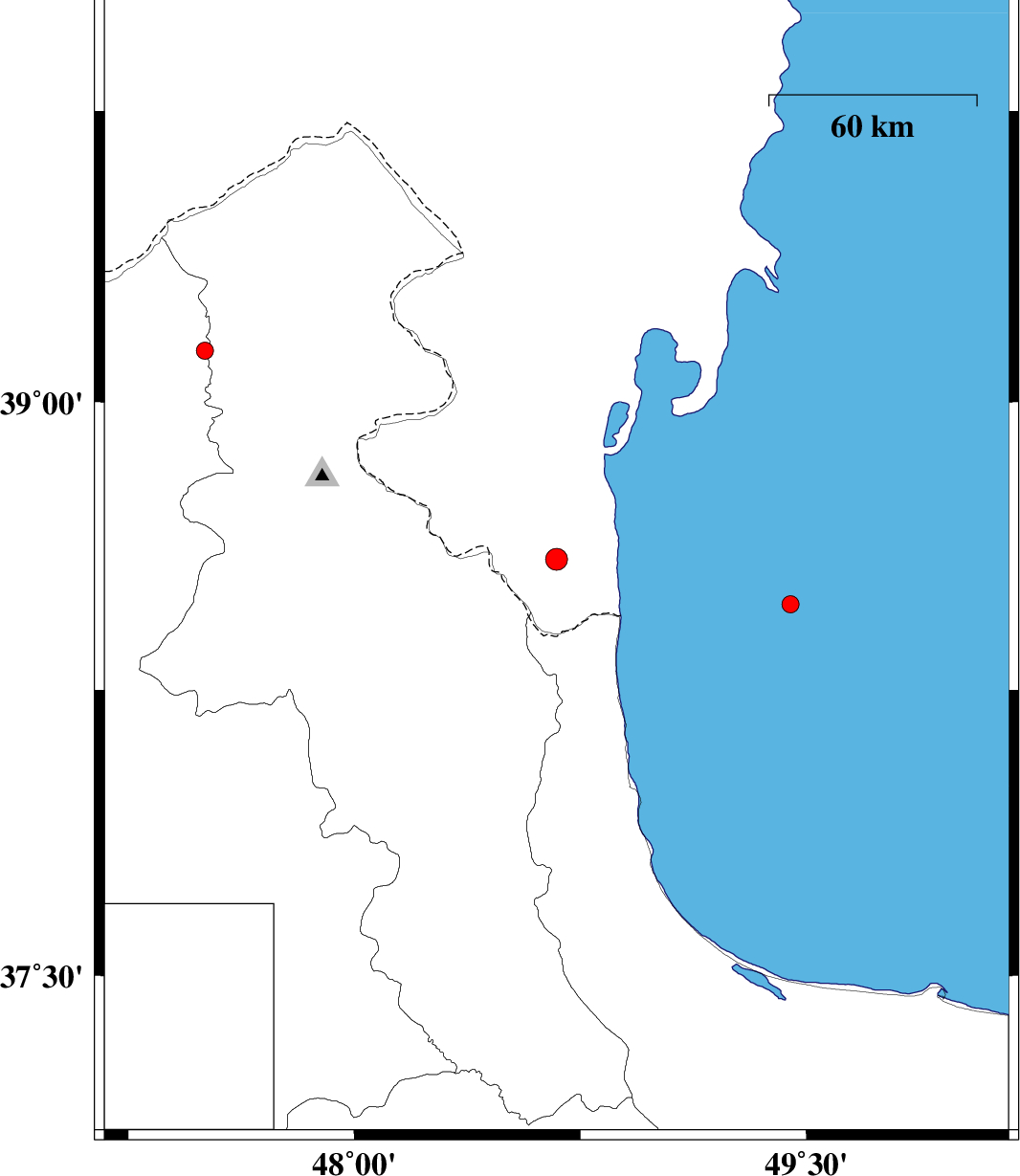 | 2018/10/11 | 00:58:29.7 | 04:28:29.7 | 38.474 | 49.447 | 16 | ML:2.6 | Caspian Sea, 52 km -East of Astara |