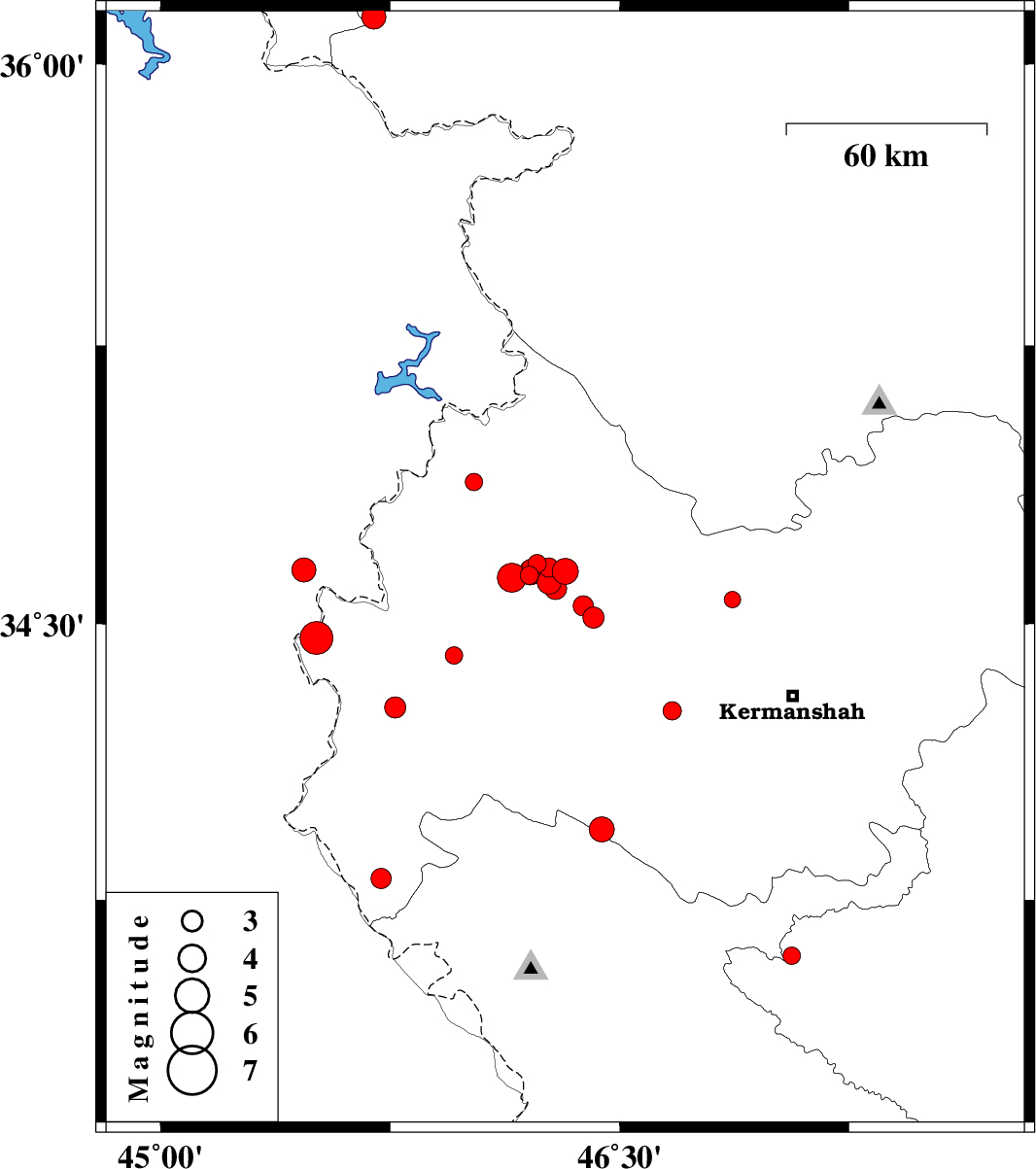 2018/11/15 | 19:45:03.8 | 23:15:03.8 | 34.642 | 46.322 | 15 | ML:3.8 | Kermanshah Province, 24 km South-West of Javanrud | ||