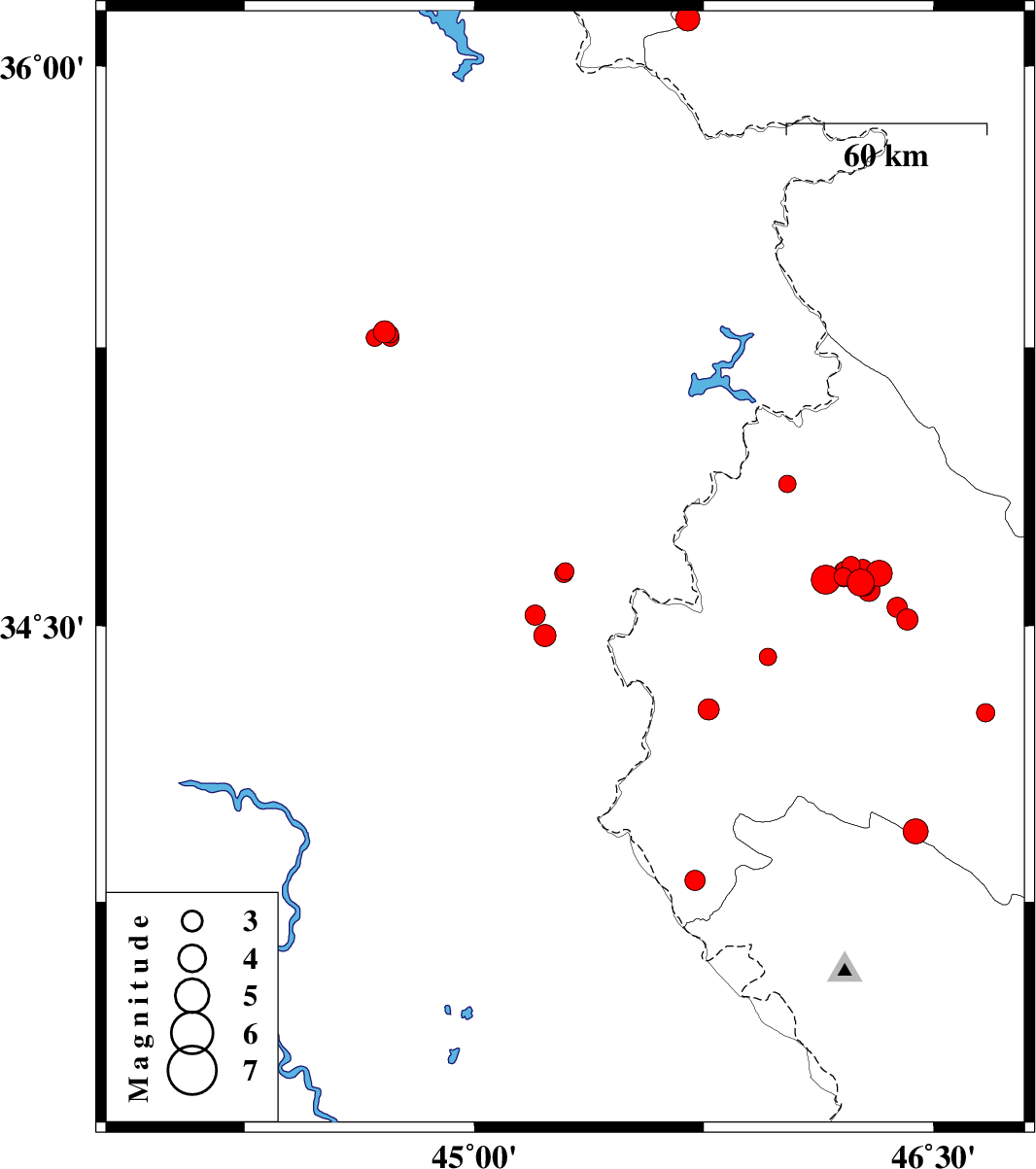 2018/11/15 | 19:45:03.8 | 23:15:03.8 | 34.642 | 46.322 | 15 | ML:3.8 | Kermanshah Province, 24 km South-West of Javanrud | ||