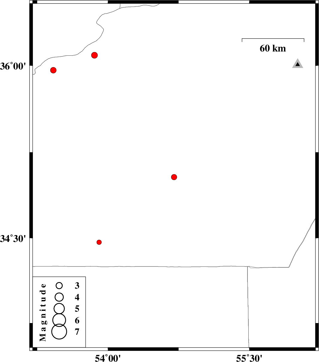 | 2018/10/22 | 10:57:17.1 | 14:27:17.1 | 34.464 | 53.907 | 14 | ML:2.2 | Semnan Province, 131 km South-East of Semnan | ||