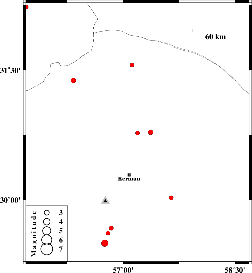 2018/11/09 | 19:25:55.7 | 22:55:55.7 | 29.606 | 56.796 | 14 | ML:2.5 | Kerman Province, 41 km South-East of Bardsir | ||