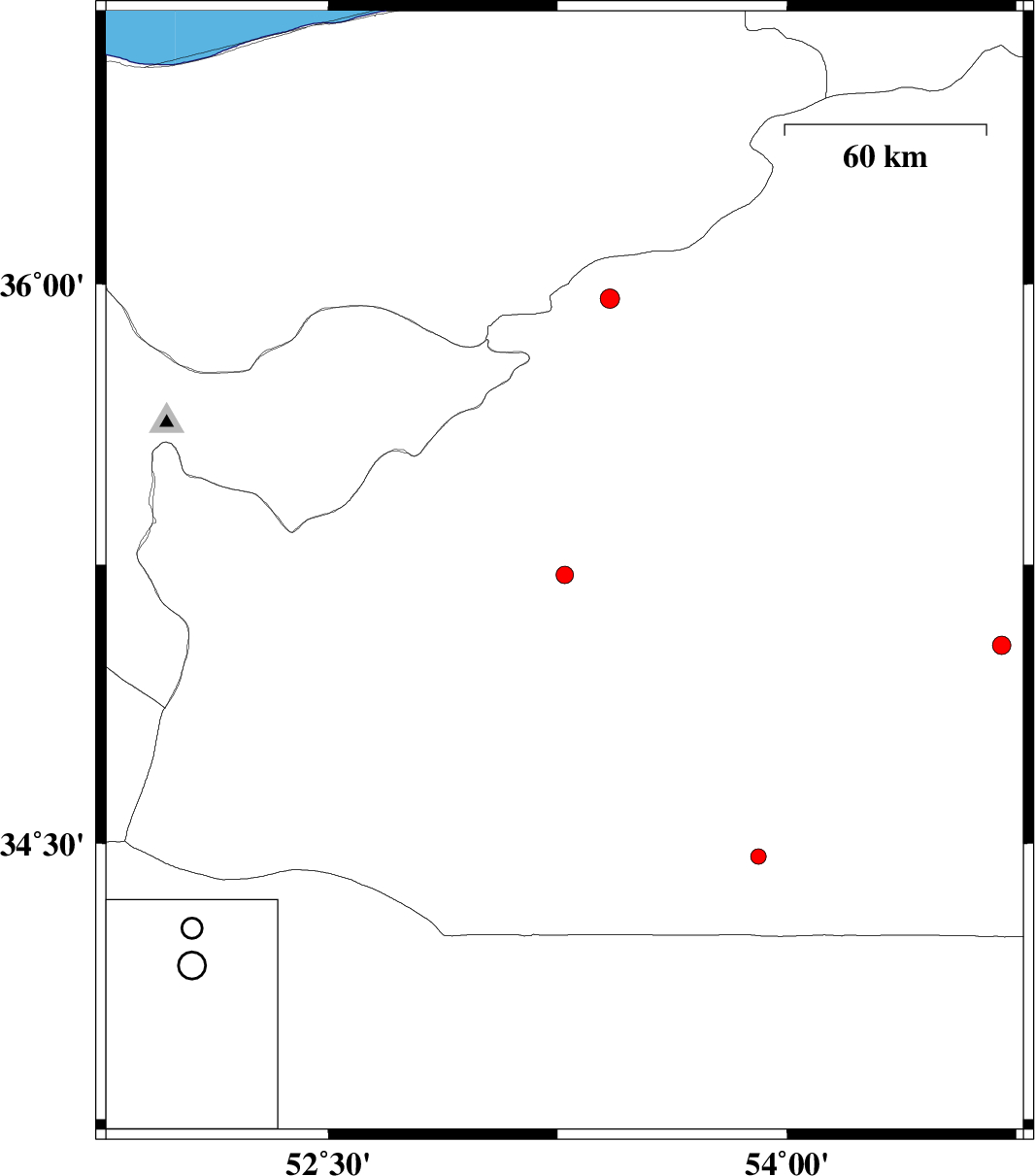 | 2018/11/14 | 02:13:28.9 | 05:43:28.9 | 35.961 | 53.421 | 15 | ML:2.8 | Semnan Province, 44 km North of Semnan | ||