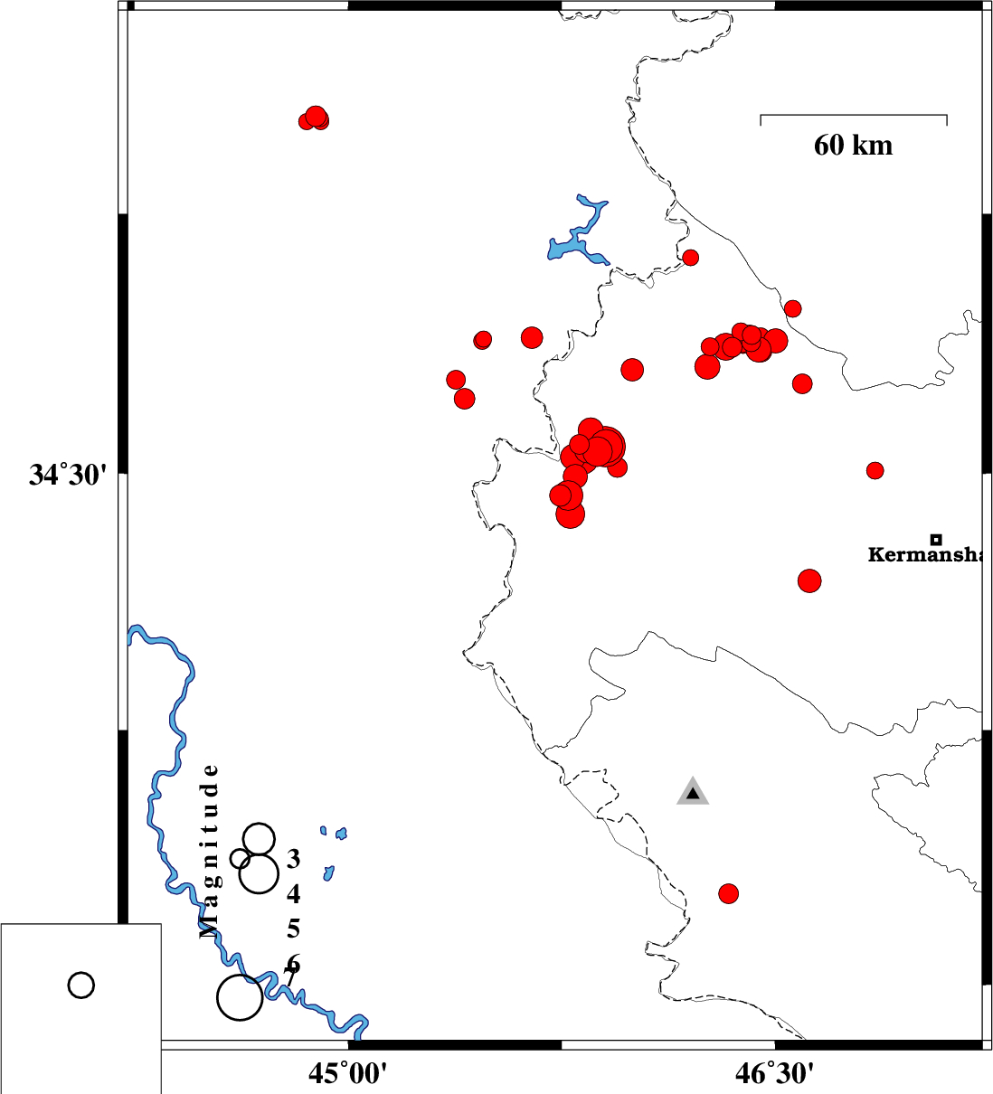 2018/11/21 | 05:37:55.8 | 09:07:55.8 | 34.658 | 46.238 | 6 | ML:2.9 | Kermanshah Province, 27 km South-West of Javanrud | ||