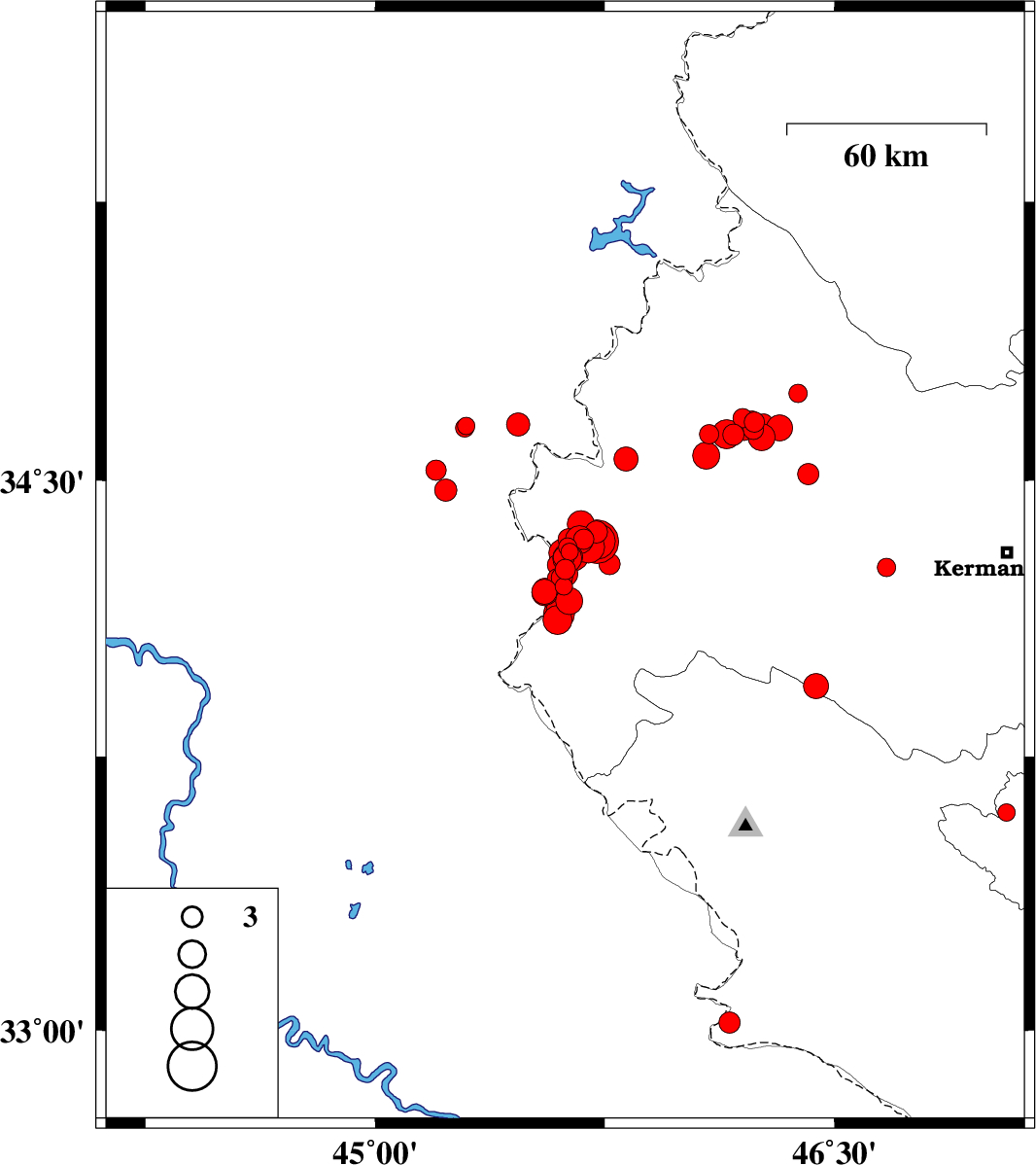 2018/11/23 | 13:03:30.0 | 16:33:30.0 | 34.651 | 45.467 | 15 | ML:3.4 | Iraq, 18 km North-West of Qasr-E-Shirin | ||
