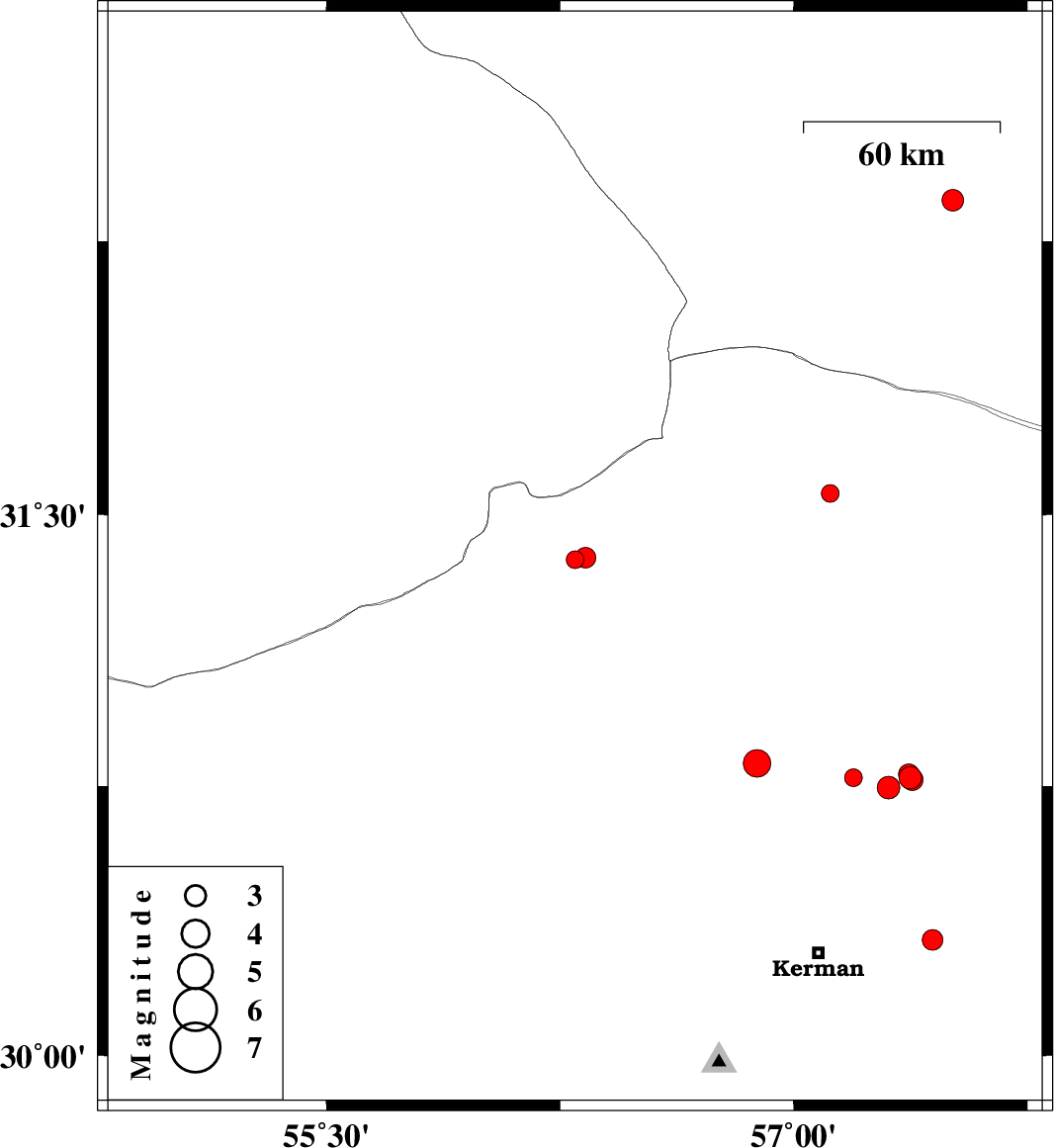 2018/11/12 | 19:40:16.1 | 23:10:16.1 | 31.559 | 57.117 | 18 | ML:2.6 | Kerman Province, 44 km North-East of Ravar | ||