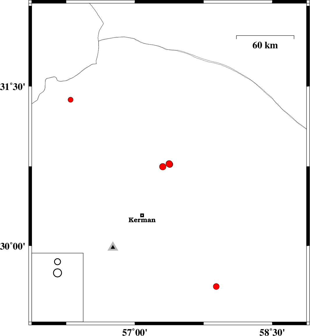 2018/12/02 | 15:44:54.4 | 19:14:54.4 | 29.611 | 57.888 | 14 | ML:2.9 | Kerman Province, 72 km North-West of Bam | ||