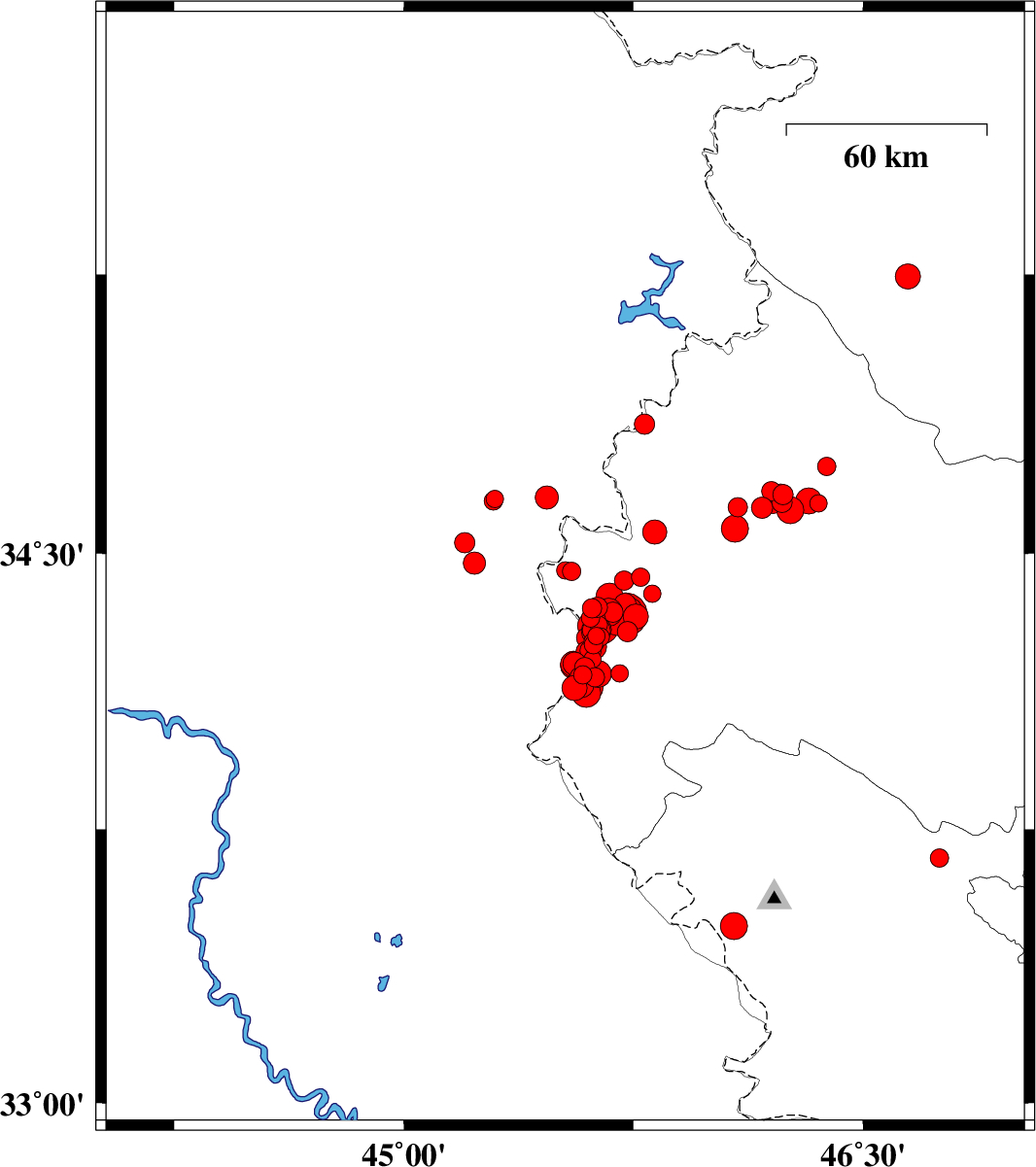 2018/11/23 | 13:03:30.0 | 16:33:30.0 | 34.651 | 45.467 | 15 | ML:3.4 | Iraq, 18 km North-West of Qasr-E-Shirin | ||