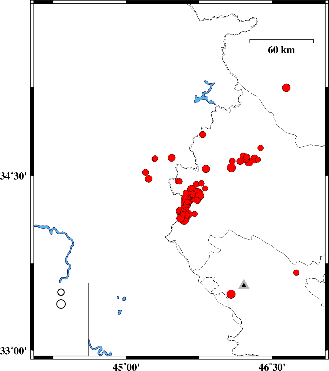 2018/11/23 | 13:03:30.0 | 16:33:30.0 | 34.651 | 45.467 | 15 | ML:3.4 | Iraq, 18 km North-West of Qasr-E-Shirin | ||