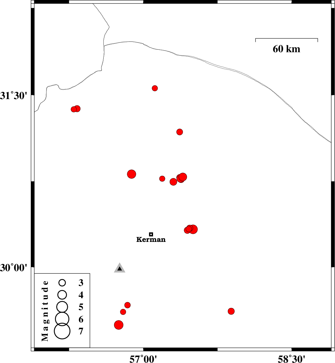 2018/12/07 | 23:43:59.9 | 03:13:59.9 | 30.334 | 57.459 | 14 | ML:2.7 | Kerman Province, 37 km -East of Kerman | ||