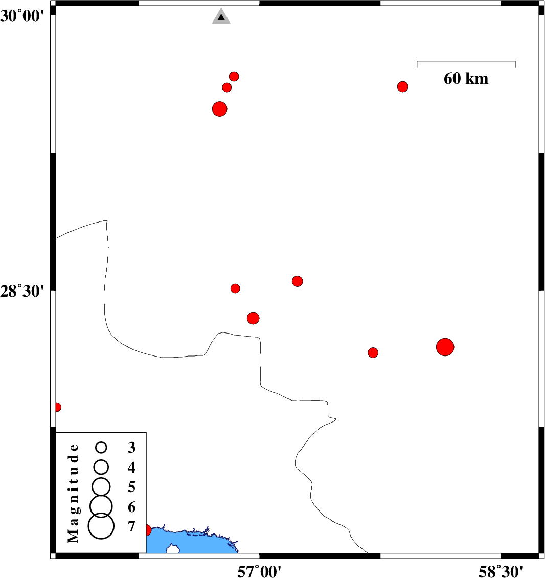 2018/11/09 | 19:25:55.7 | 22:55:55.7 | 29.606 | 56.796 | 14 | ML:2.5 | Kerman Province, 41 km South-East of Bardsir | ||