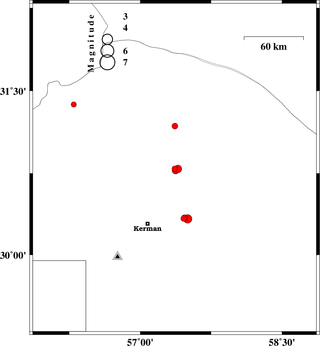 2018/12/07 | 23:43:59.9 | 03:13:59.9 | 30.334 | 57.459 | 14 | ML:2.7 | Kerman Province, 37 km -East of Kerman | ||