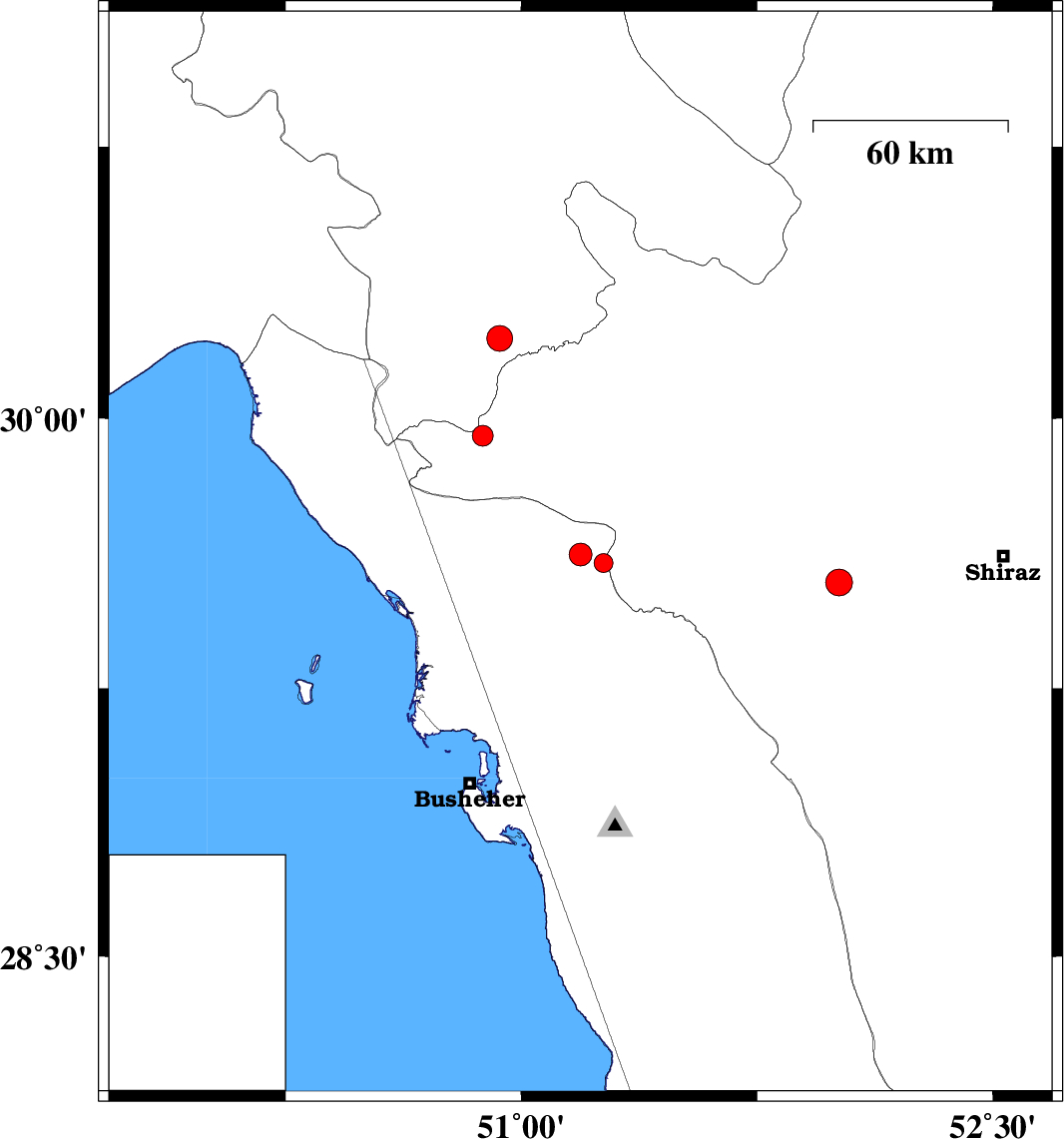 2018/12/13 | 12:29:09.7 | 15:59:09.7 | 29.599 | 51.261 | 17 | ML:2.7 | Bushehr Province, 38 km North of Borazjan | ||