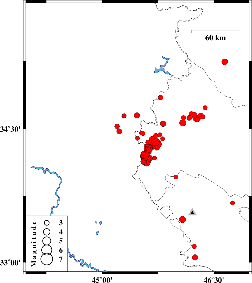 2018/11/23 | 13:03:30.0 | 16:33:30.0 | 34.651 | 45.467 | 15 | ML:3.4 | Iraq, 18 km North-West of Qasr-E-Shirin | ||
