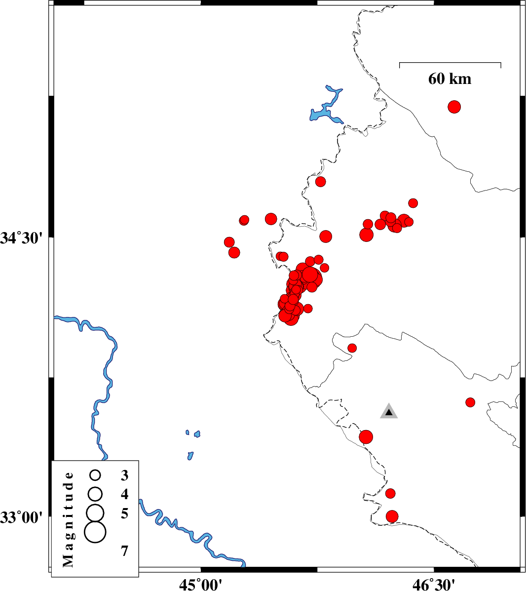 2018/11/23 | 13:03:30.0 | 16:33:30.0 | 34.651 | 45.467 | 15 | ML:3.4 | Iraq, 18 km North-West of Qasr-E-Shirin | ||