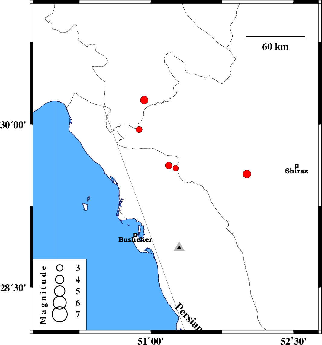 2018/12/13 | 12:29:09.7 | 15:59:09.7 | 29.599 | 51.261 | 17 | ML:2.7 | Bushehr Province, 38 km North of Borazjan | ||