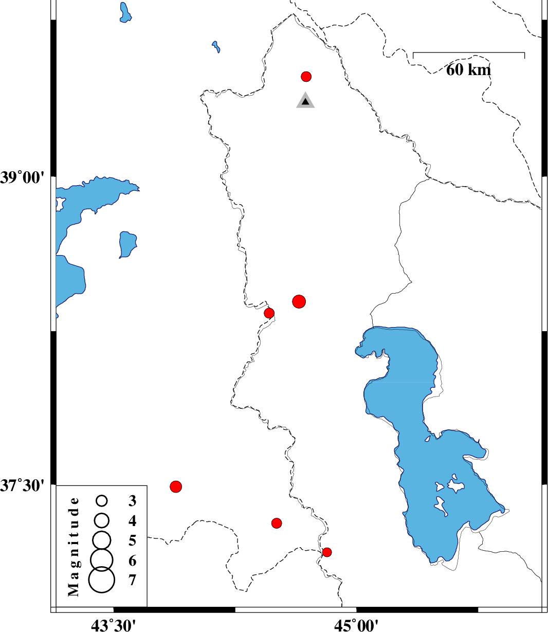 2018/12/02 | 05:47:38.3 | 09:17:38.3 | 39.478 | 44.688 | 8 | ML:2.8 | Azarbaijan Gharbi Province, 26 km North-East of Maku | ||