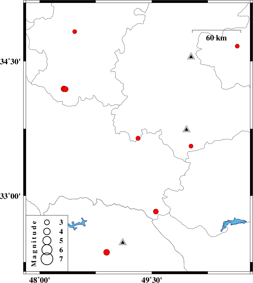2019/01/06 | 20:00:31.3 | 23:30:31.3 | 33.644 | 49.316 | 6 | ML:2.7 | Lorestan Province, 25 km North-West of Azna | ||