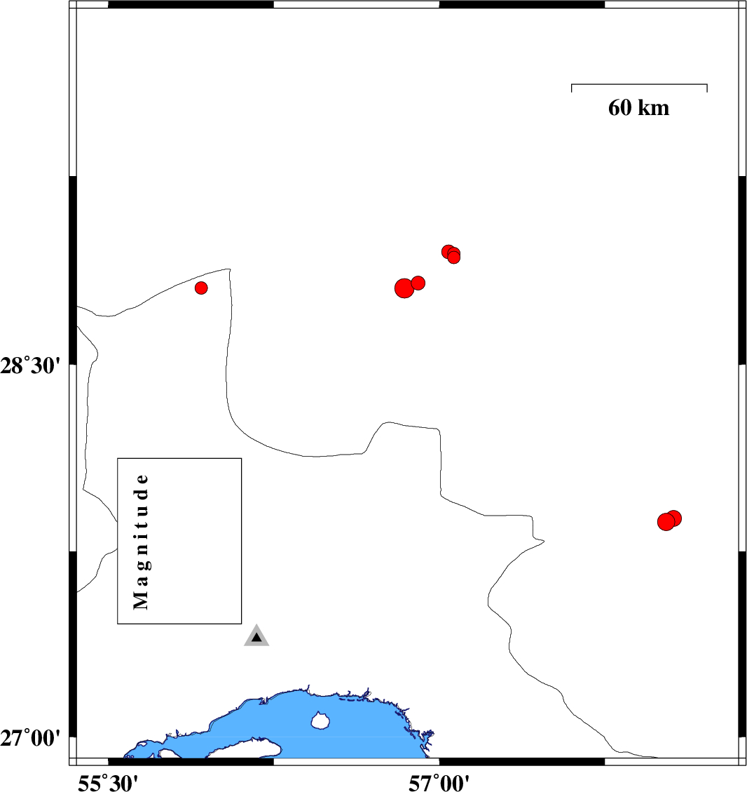 2019/01/01 01:20:45.5 04:50:45.5 27.34257.87514 ML:3.2 Kerman Province, 38 km -East of Manujan