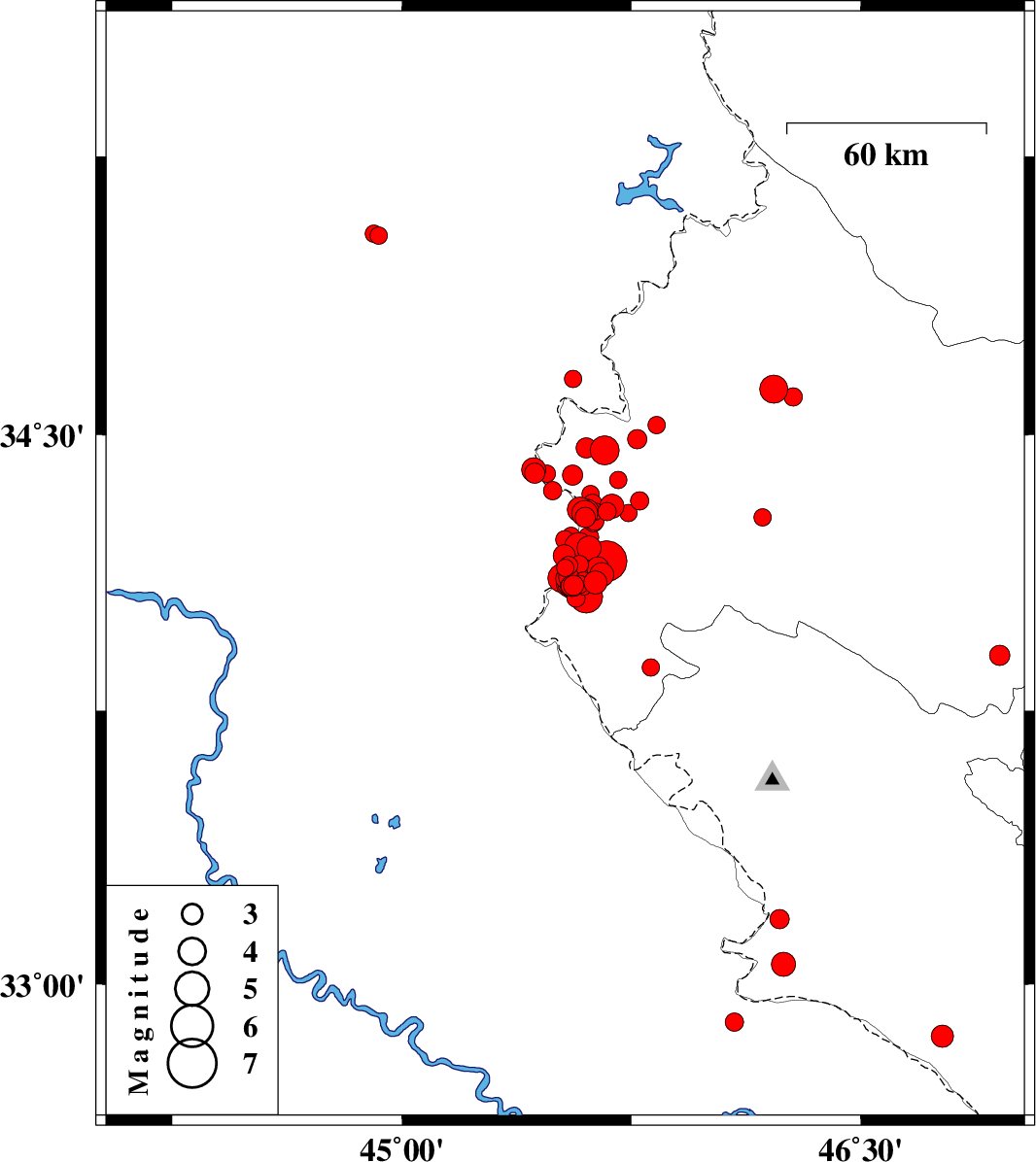 2019/01/06 | 14:03:55.1 | 17:33:55.1 | 34.09 | 45.577 | 14 | ML:3.5 | Kermanshah Province, 32 km -West of Gilan-E-Gharb | ||