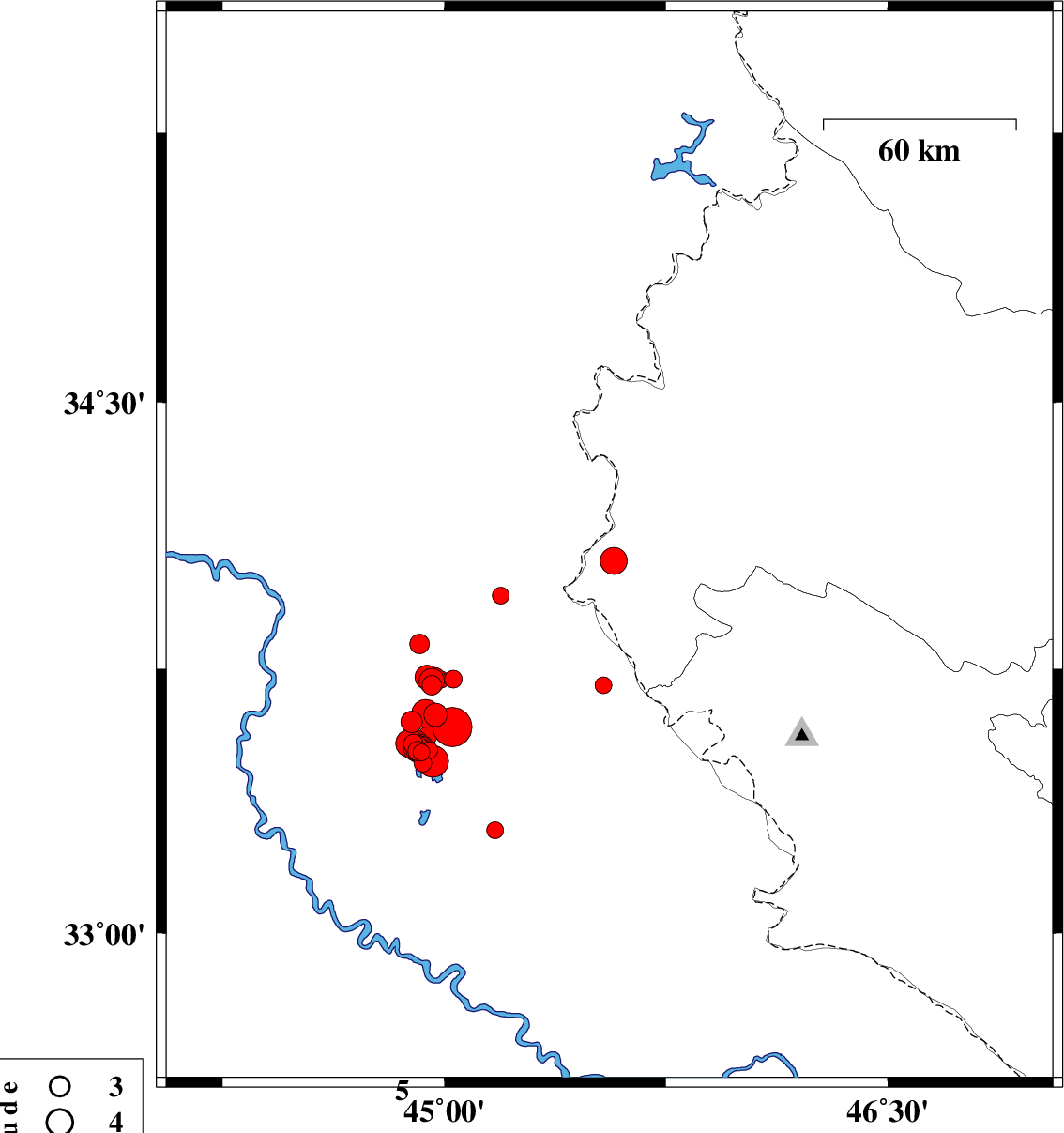 2019/01/06 | 14:07:29.2 | 17:37:29.2 | 34.173 | 45.531 | 14 | ML:3.2 | Iraq, 38 km South of Qasr-E-Shirin | ||