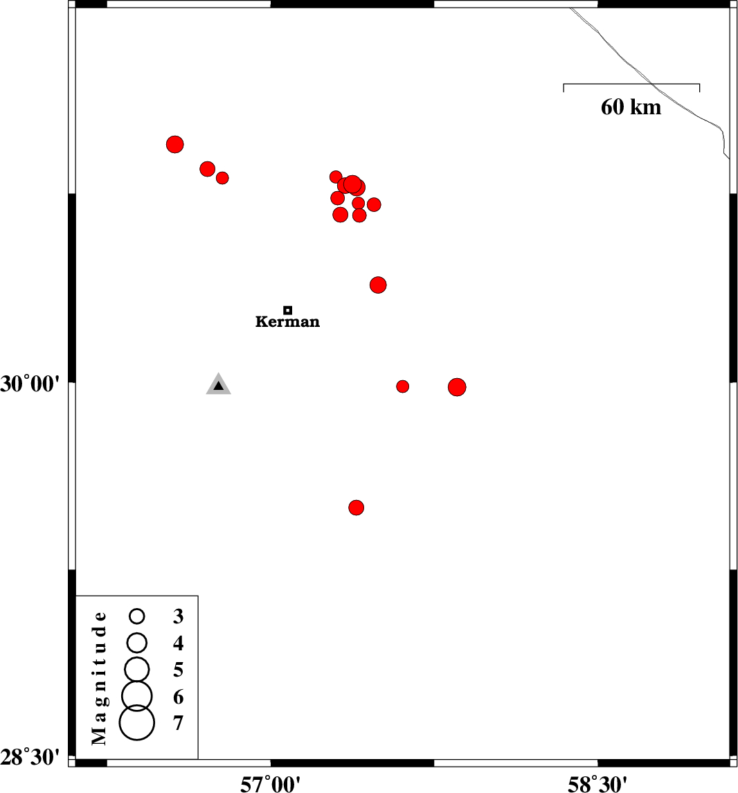 2019/01/02 | 04:20:40.4 | 07:50:40.4 | 30.664 | 57.406 | 14 | ML:2.8 | Kerman Province, 52 km North-East of Kerman | ||