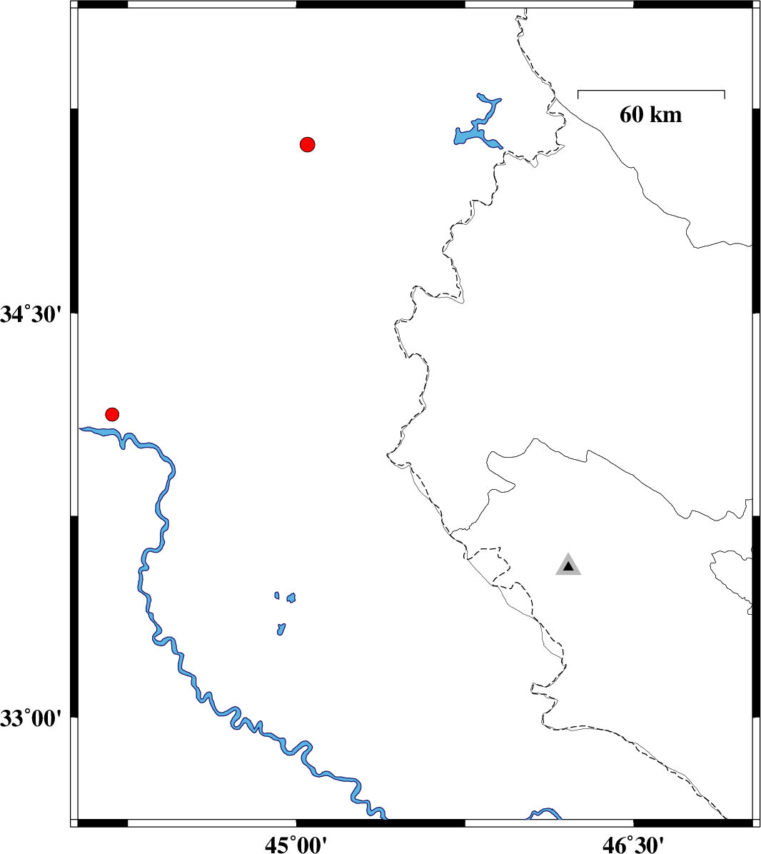 2019/01/09 | 06:03:58.2 | 09:33:58.2 | 32.896 | 46.086 | 14 | ML:2.7 | Iraq, 26 km South of Mehran | ||