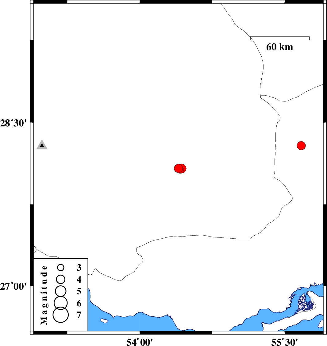 2019/01/04 | 15:16:47.3 | 18:46:47.3 | 28.08 | 54.4 | 10 | Mb:3.9 | Fars Province, 45 km North of Lar | ||