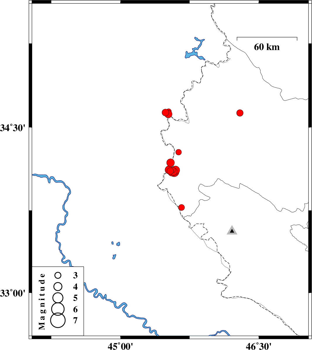 2019/01/15 | 01:55:04.6 | 05:25:04.6 | 34.642 | 45.523 | 17 | ML:2.7 | Iraq, 15 km North of Qasr-E-Shirin | ||