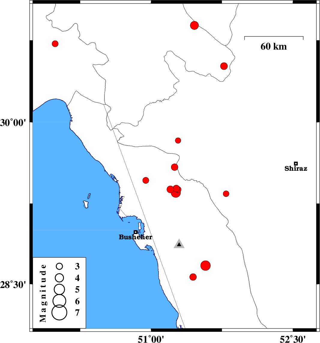 2019/01/10 | 00:34:24.7 | 04:04:24.7 | 29.38 | 51.204 | 17 | ML:3.4 | Bushehr Province, 13 km North of Borazjan | ||