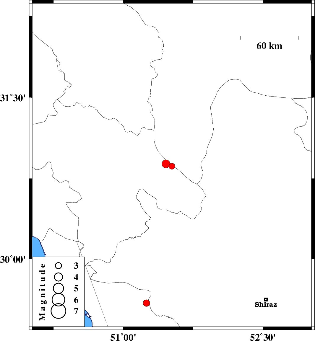 2019/01/21 | 22:33:59.8 | 02:03:59.8 | 29.586 | 51.249 | 14 | ML:3.2 | Bushehr Province, 36 km North of Borazjan | ||