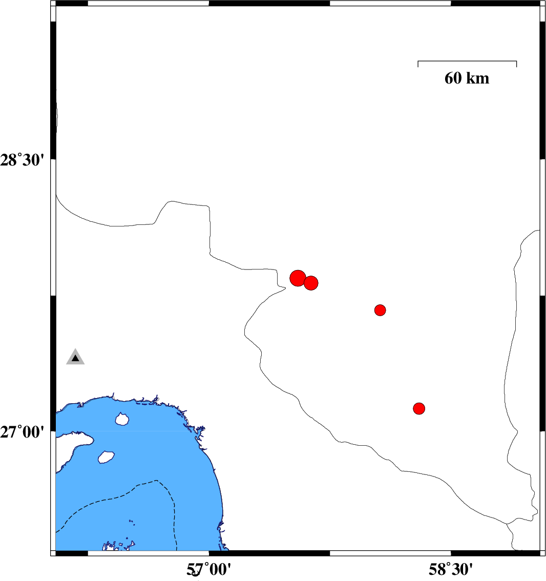 2019/01/24 | 04:55:54.4 | 08:25:54.4 | 27.835 | 57.551 | 14 | ML:3.3 | Kerman Province, 19 km South-West of Kahnuj | ||
