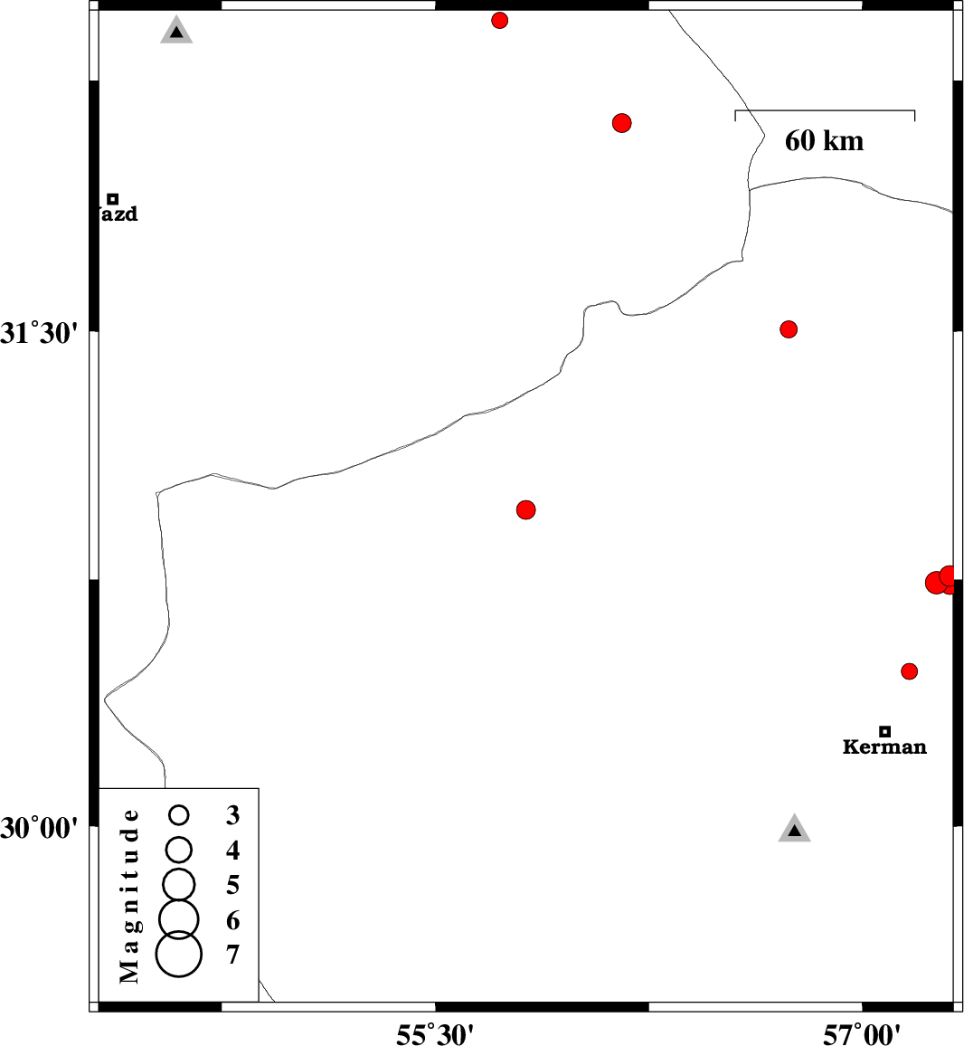 2018/12/30 | 06:13:18.3 | 09:43:18.3 | 30.732 | 57.306 | 14 | ML:2.8 | Kerman Province, 54 km North-East of Kerman |