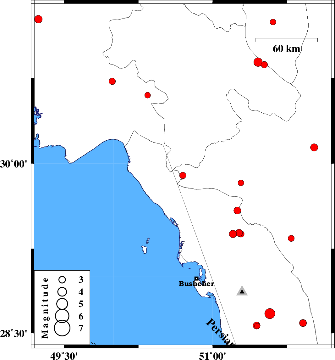 2019/01/04 | 16:05:14.1 | 19:35:14.1 | 29.379 | 51.286 | 14 | ML:2.9 | Bushehr Province, 15 km North of Borazjan |