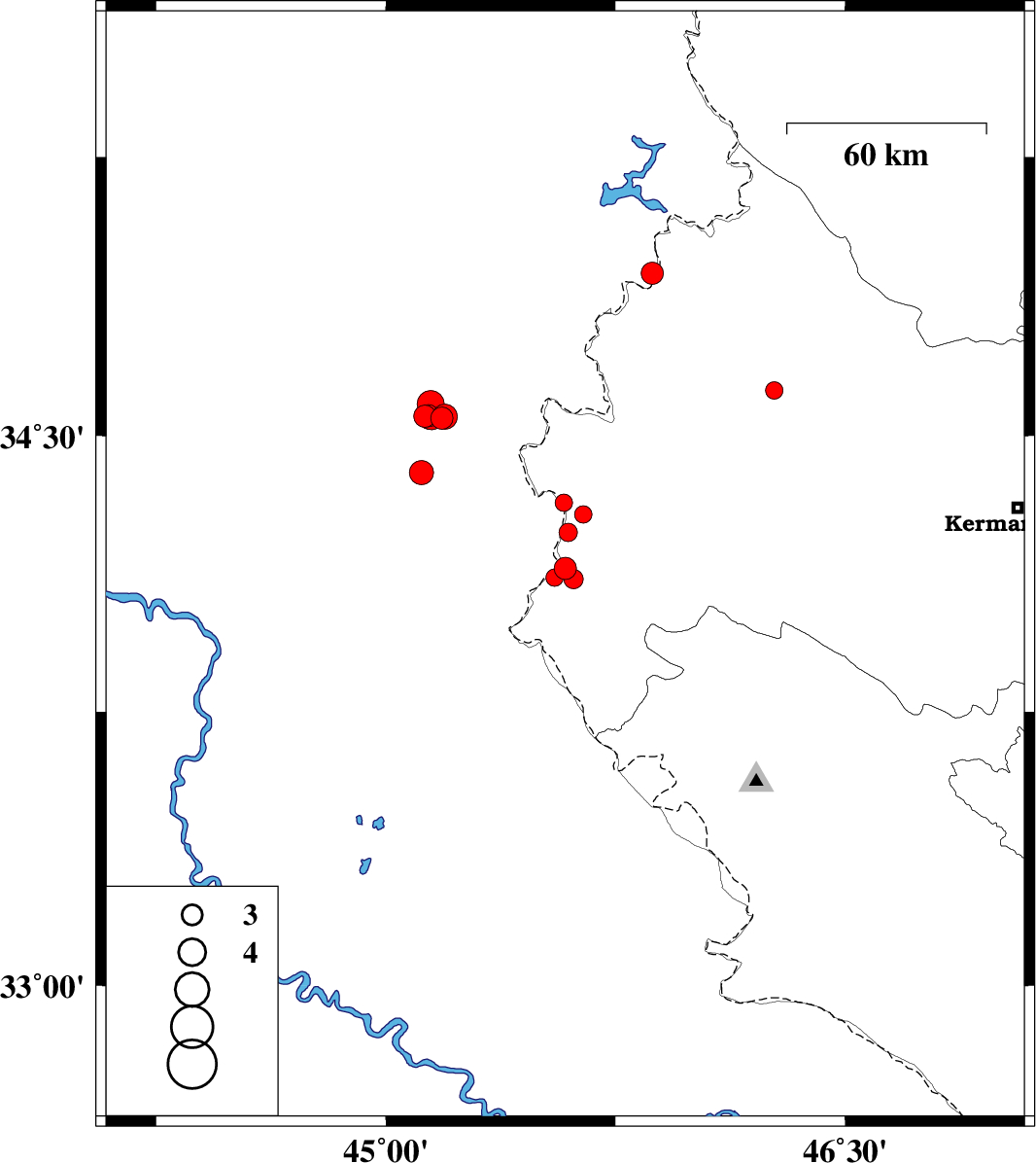 2019/01/29 | 06:00:22.8 | 09:30:22.8 | 34.4 | 45.117 | 14 | ML:3.5 | Iraq, 45 km South-West of Qasr-E-Shirin | ||