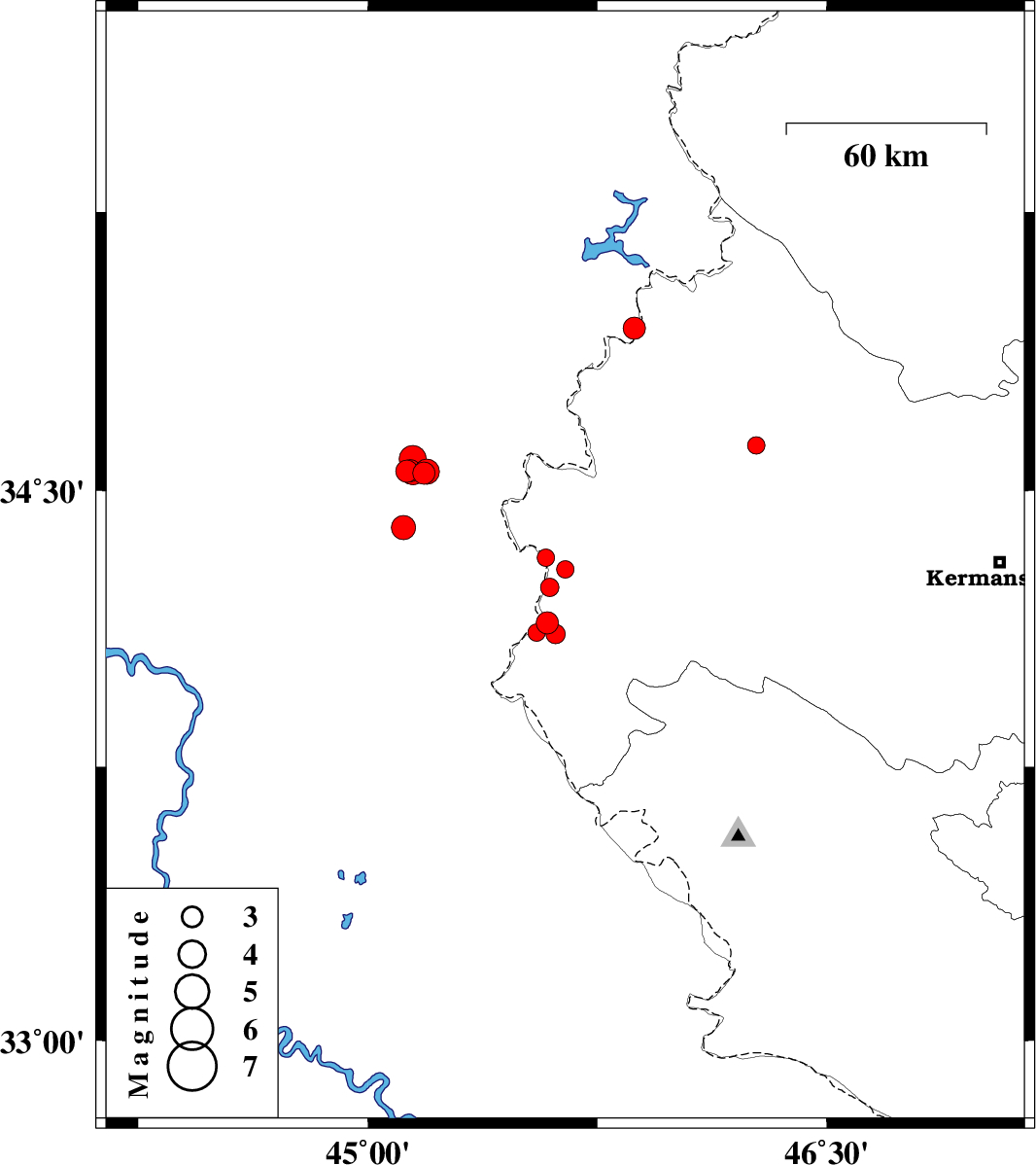 2019/01/29 | 06:00:22.8 | 09:30:22.8 | 34.4 | 45.117 | 14 | ML:3.5 | Iraq, 45 km South-West of Qasr-E-Shirin | ||