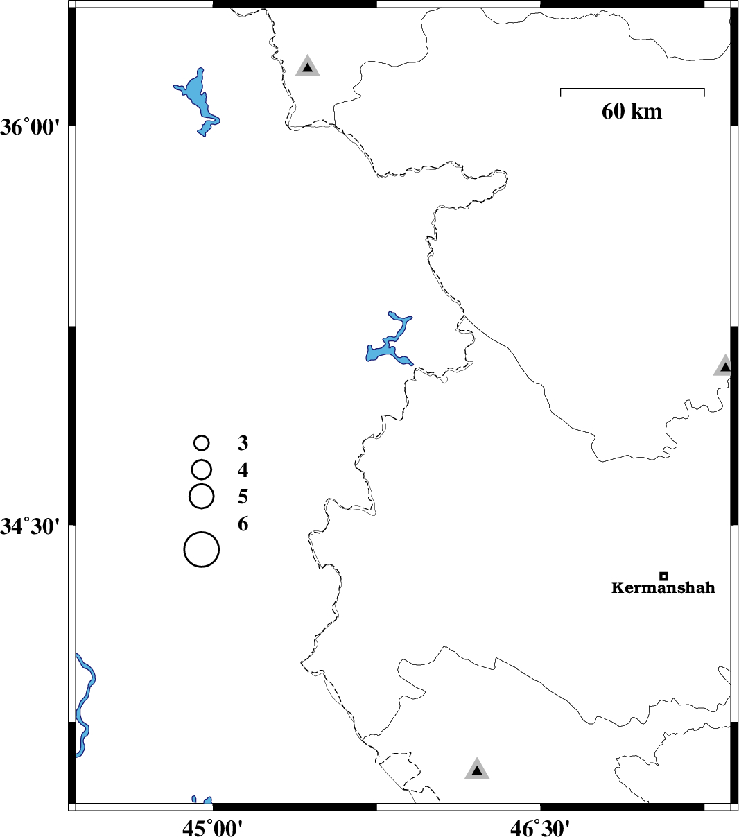 2019/01/29 | 06:00:22.8 | 09:30:22.8 | 34.4 | 45.117 | 14 | ML:3.5 | Iraq, 45 km South-West of Qasr-E-Shirin | ||