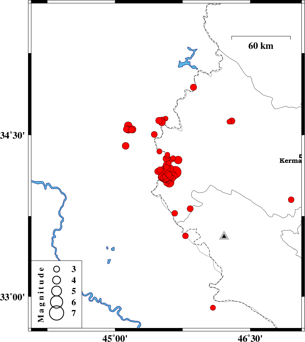 2019/01/06 | 14:03:55.1 | 17:33:55.1 | 34.09 | 45.577 | 14 | ML:3.5 | Kermanshah Province, 32 km -West of Gilan-E-Gharb | ||