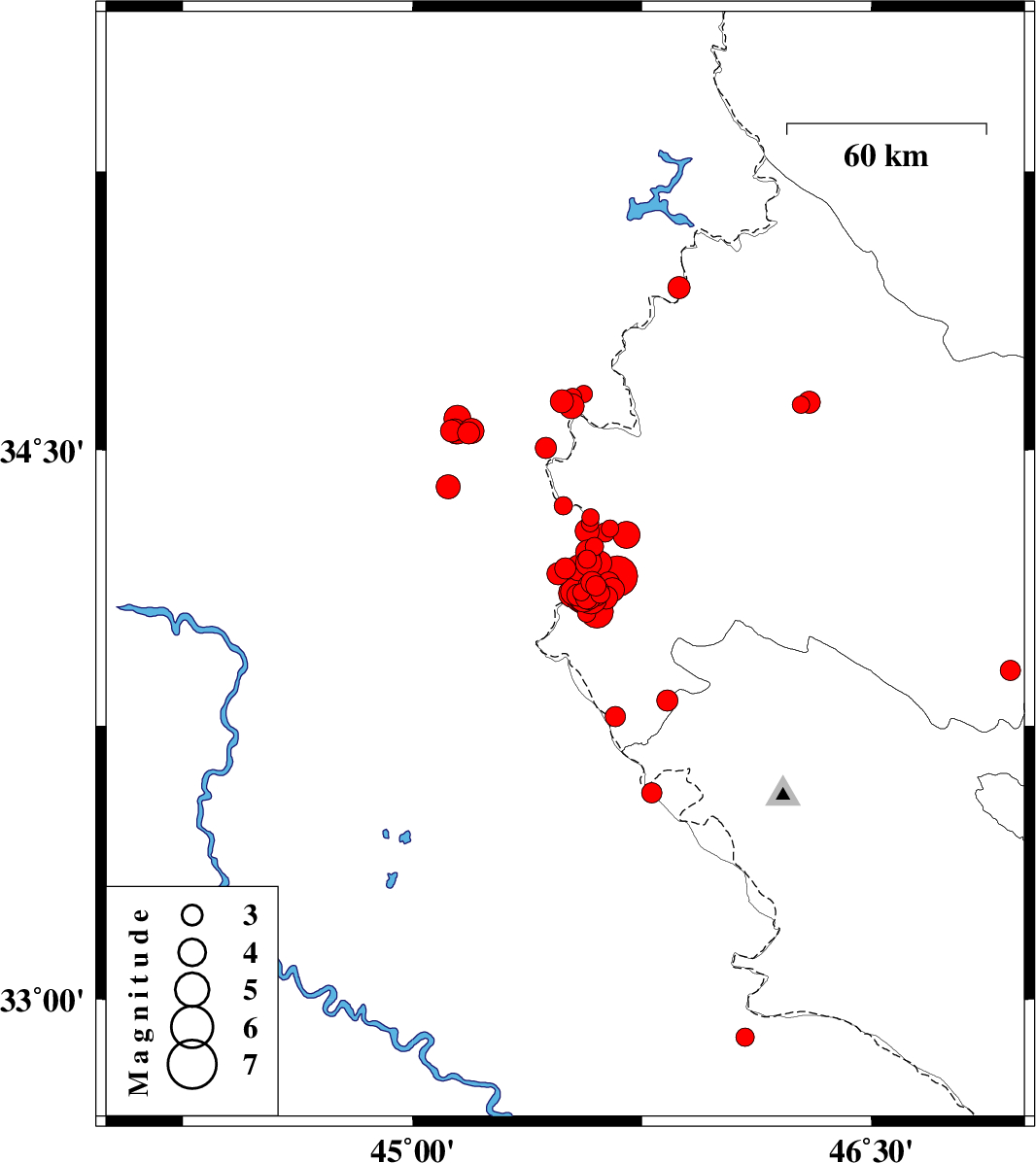 2019/01/29 | 06:00:22.8 | 09:30:22.8 | 34.4 | 45.117 | 14 | ML:3.5 | Iraq, 45 km South-West of Qasr-E-Shirin | ||
