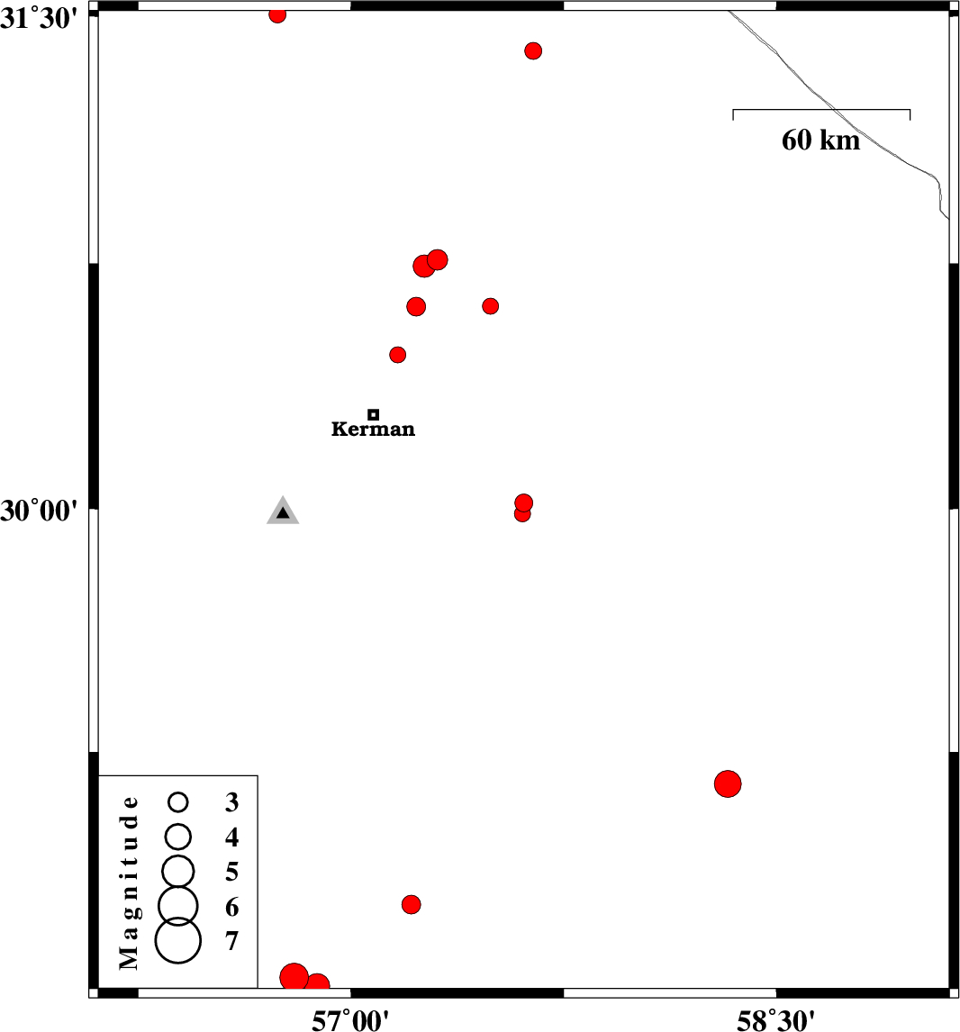 2019/01/28 | 13:39:16.1 | 17:09:16.1 | 30.619 | 57.491 | 14 | ML:2.6 | Kerman Province, 54 km North-East of Kerman | ||