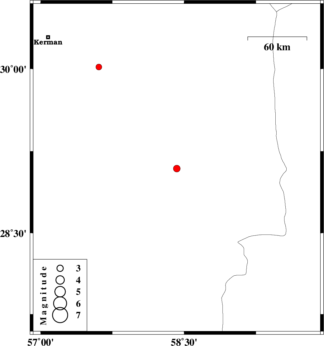 2019/02/18 | 14:54:01.5 | 18:24:01.5 | 29.091 | 58.423 | 14 | ML:3.2 | Kerman Province, 7 km of Bam | ||