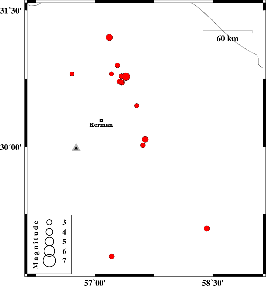 2019/03/02 | 10:04:47.4 | 13:34:47.4 | 30.774 | 57.393 | 14 | ML:4.5 | Kerman Province, 62 km North-East of Kerman | ||
