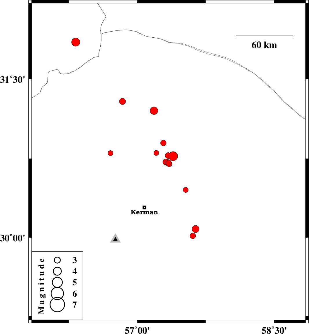 2019/03/02 | 23:35:14.0 | 03:05:14.0 | 30.082 | 57.638 | 14 | ML:3.5 | Kerman Province, 58 km South-East of Kerman | ||