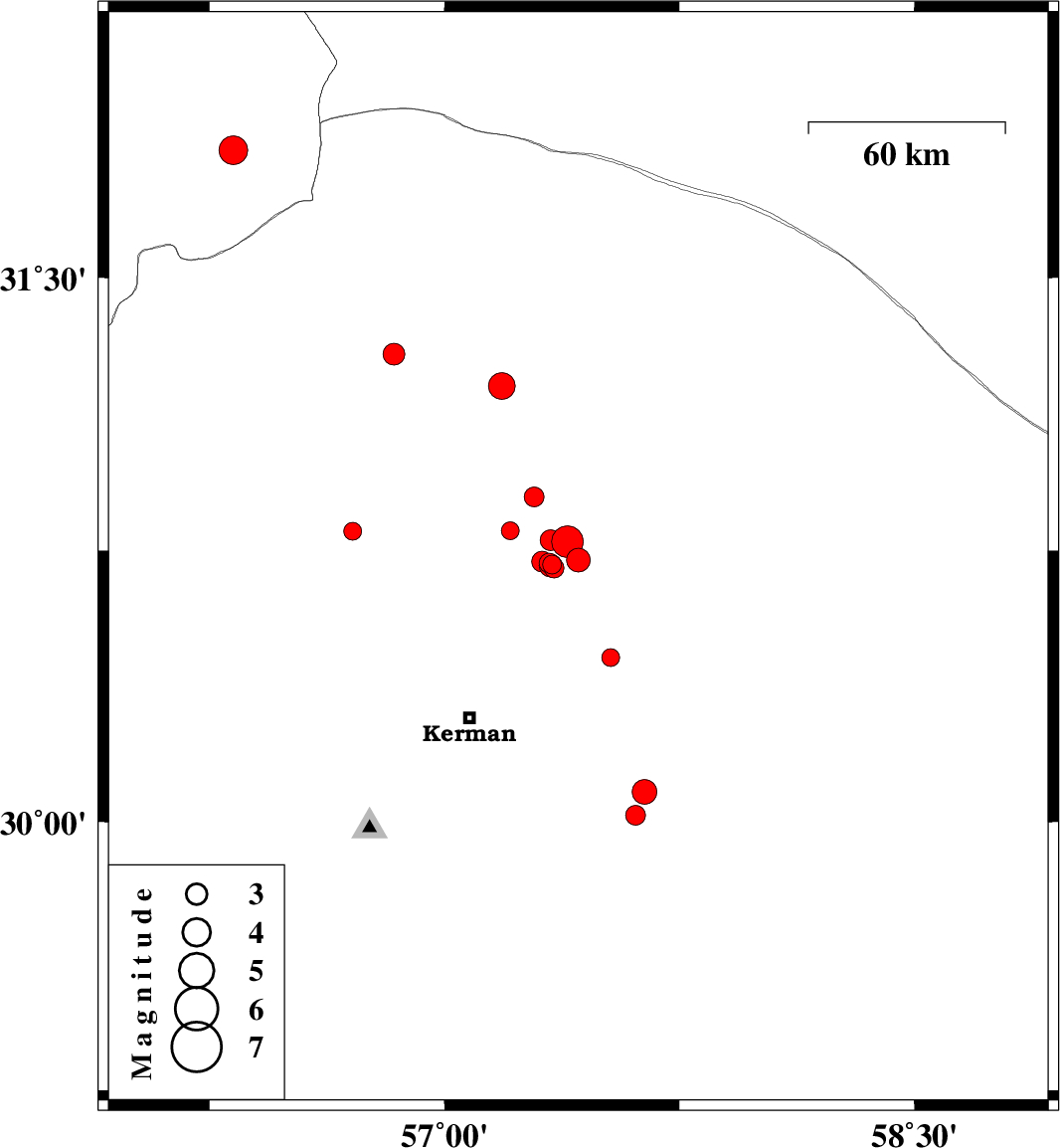 2019/03/02 | 10:04:47.4 | 13:34:47.4 | 30.774 | 57.393 | 14 | ML:4.5 | Kerman Province, 62 km North-East of Kerman | ||