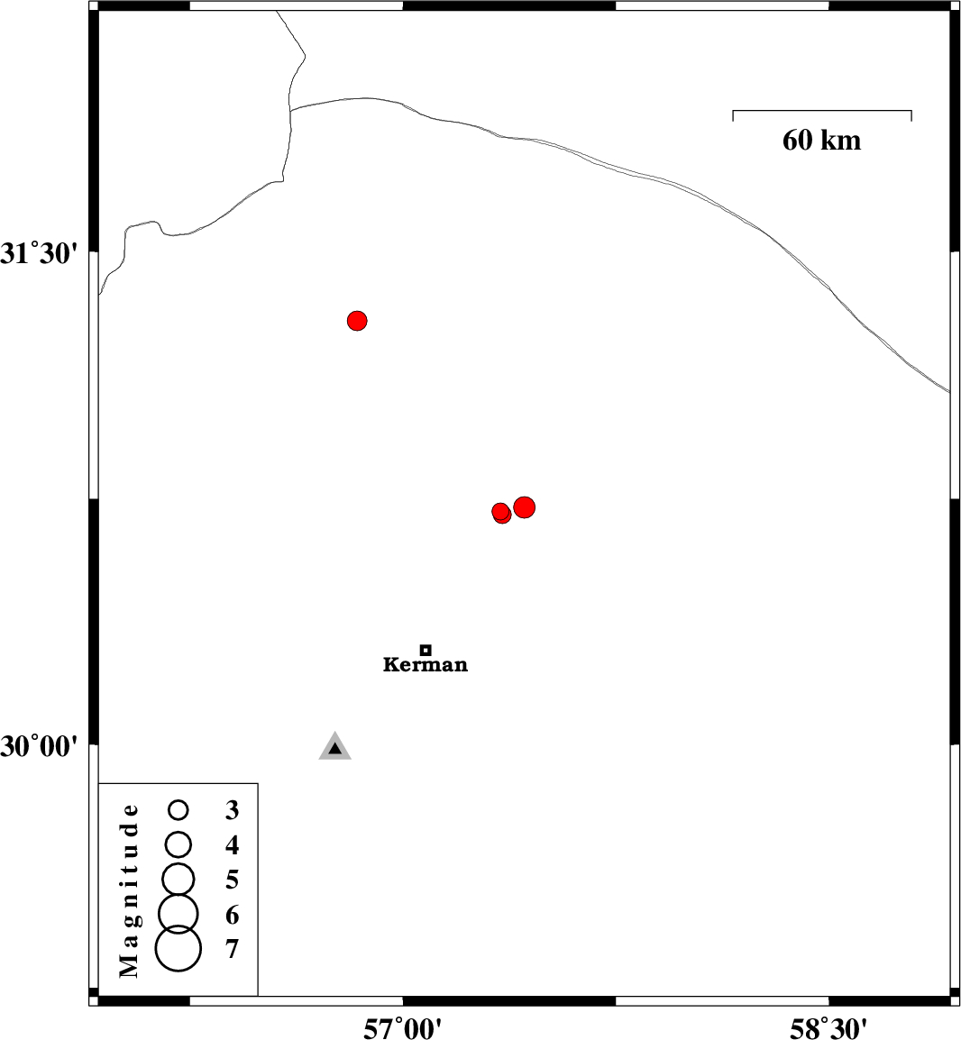 2019/03/10 | 17:36:53.7 | 21:06:53.7 | 30.711 | 57.343 | 14 | ML:2.7 | Kerman Province, 53 km North-East of Kerman | ||