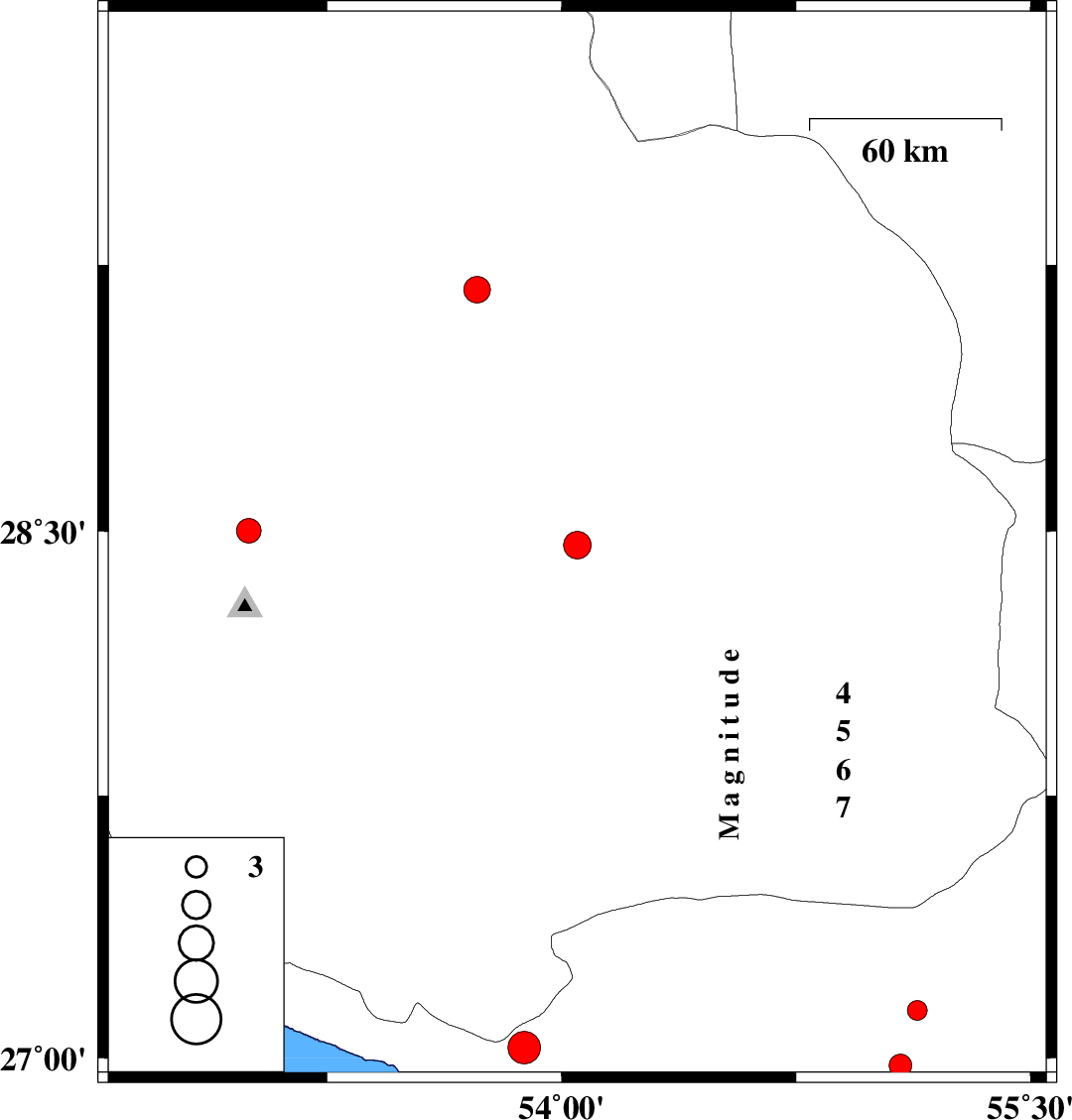 2019/03/22 | 13:26:20.1 | 17:56:20.1 | 28.46 | 54.05 | 10 | Mb:4 | Fars Province, 48 km -East of Jahrom | ||