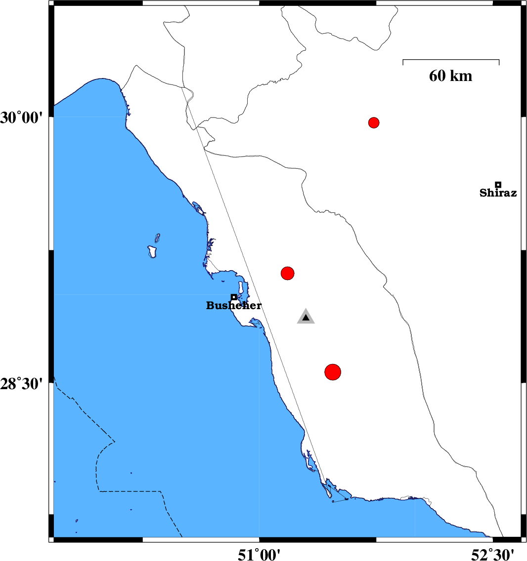 2019/04/19 | 00:57:45.5 | 05:27:45.5 | 29.12 | 51.18 | 5 | ML:3.8 | Bushehr Province, 16 km South of Borazjan | ||