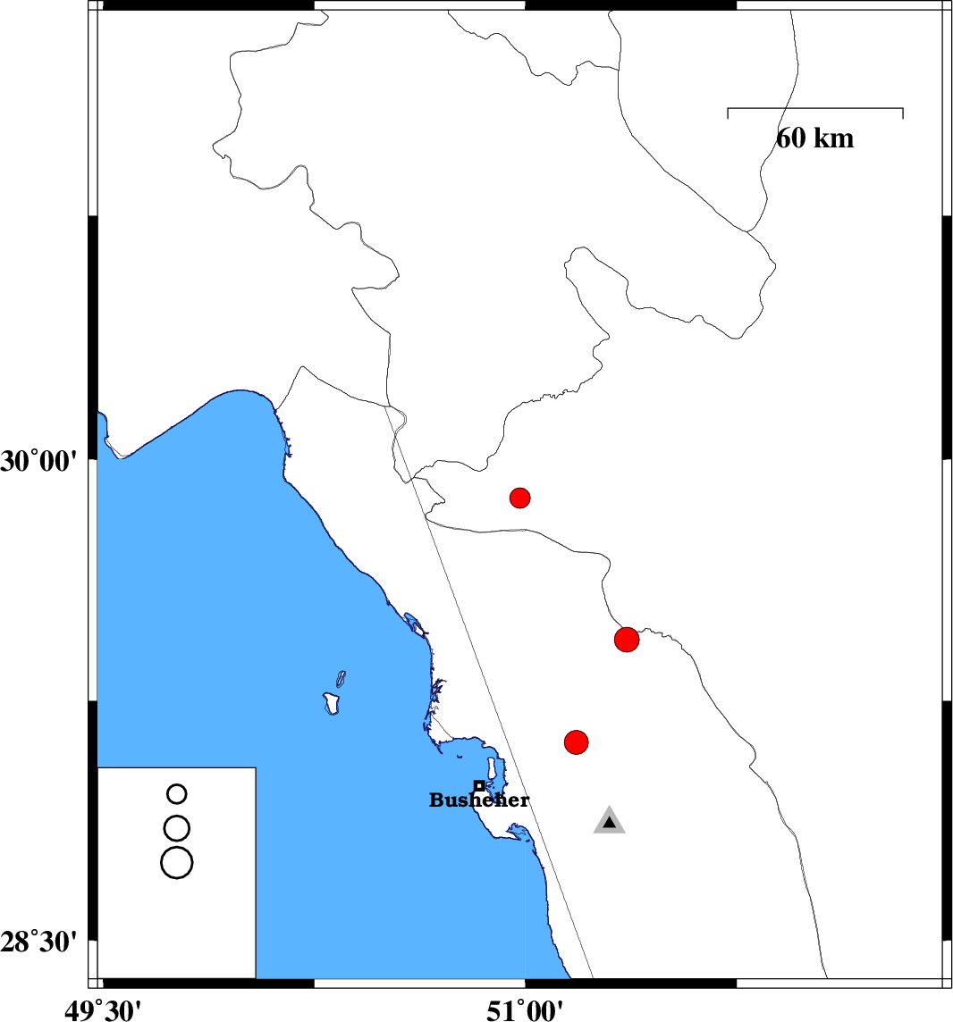 2019/04/19 | 00:57:45.5 | 05:27:45.5 | 29.12 | 51.18 | 5 | ML:3.8 | Bushehr Province, 16 km South of Borazjan |